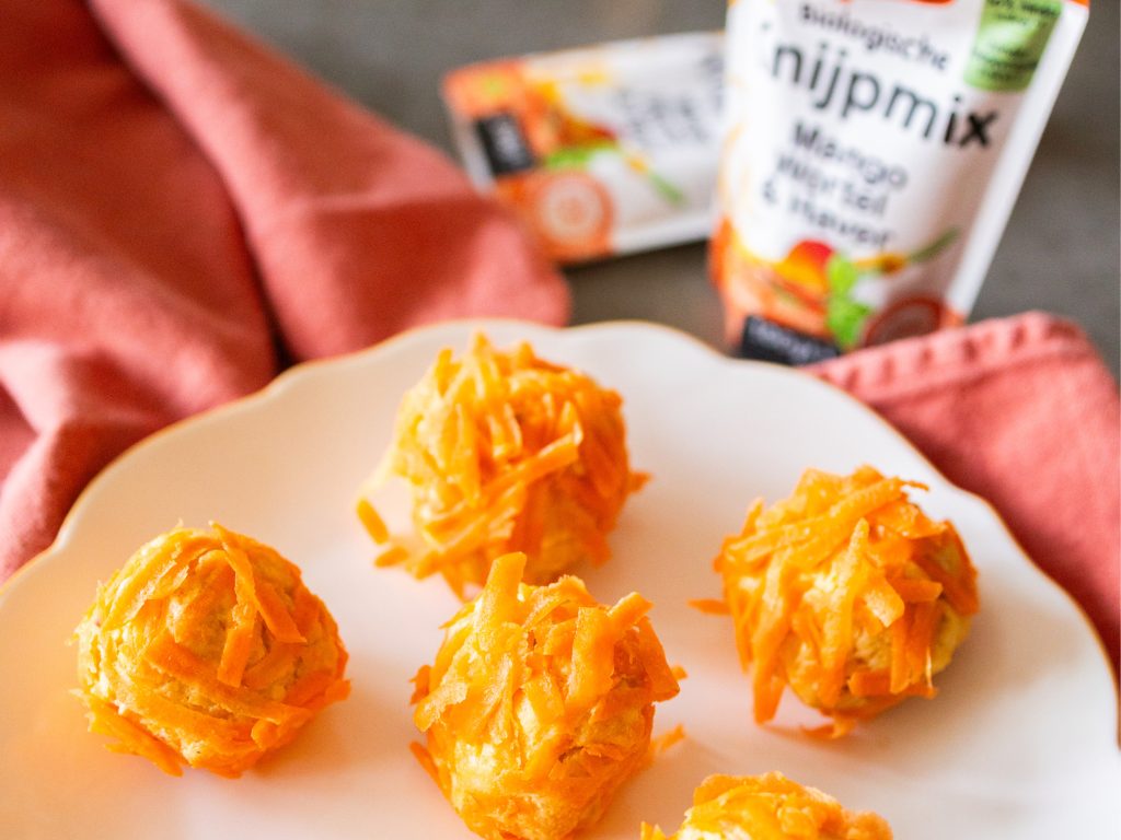 Wat deze cakepops extra lekker maakt, is de combinatie van wortel, Griekse yoghurt en onze biologische Knijpmix Mango, wortel & haver. Daardoor krijgen ze een zachte structuur en een milde, zoete smaak. Je hebt maar een paar ingrediënten nodig en ook de bereiding is heel eenvoudig. Eerst bak je een kleine cake, daarna maak je daar smeuïge balletjes van die je door geraspte wortel rolt. Het resultaat: een originele, verantwoorde traktatie die helemaal past bij Koningsdag.